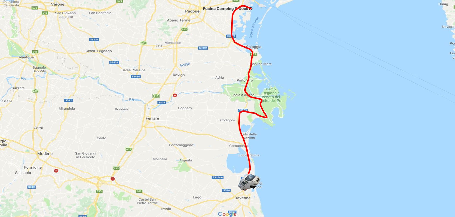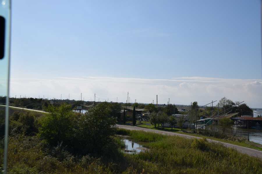 Il est temps pour nous de quitter Venise, même si nous n'avons pas eu le temps de tout faire et de tout voir surtout l'île de BURANO qui aurait demandée une journée de plus mais ce n'est que partie remise. Donc ce matin départ direction la république de SAN MARIN. Comme le monde est petit pendant que l'on se prépare pour partir une dame nous salue en passant et engage la conversation, il s'avére qu'ils habitent à 10km de chez nous et la dame est une ancienne collégue de travail de mon épouse. Résultat nous partons avec presque deux heures de retard, comme l'étape est courte aucun soucis. Nous voilà partis en direction de Ravenne étape du jour on longe la lagune pendant de nombreux km jusqu'à Chioggia. Ensuite on descend plein sud en longeant l'Adriatique que nous ne voyons pas la route passe en l'intérieur des terres, mais de nombreux ponts franchissent des petites lagunes, routes d'ailleurs pas en très bon état des radars partout, des limitations de vitesse qui changent en permanence. A midi nous dévions un peu vrs le village de Gorino pour nous rapprocher de la mer, là aussi très difficile nombreuses interdiction au CC. Finalement en milieu d'après-midi, nous arrivons au terme de notre étape une aire à proximité de Ravennes à Porto Corsini, et sur la route de Porto Corsini nous apercevons de nombreuses cabanes où en apparence on pratique la pêche au carrelet mais ceux ci sont immenses . Repos la route à été éprouvante.