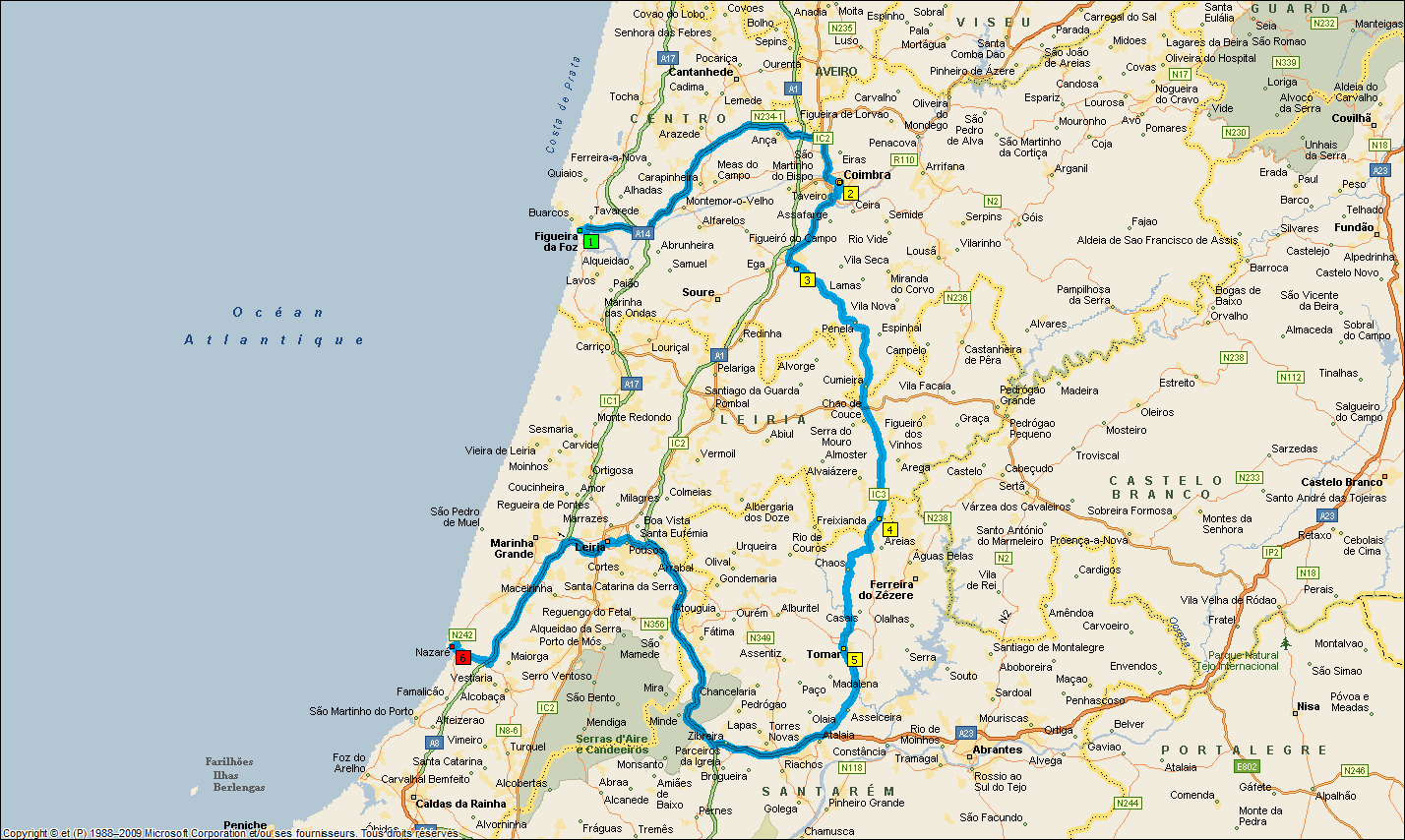 Avant le départ, petite balade pour les filles dans les pins. Au sol, des bruyères et des lavandes partout. On croirait vraiment dans Les Landes. Il fait très beau et commence déjà à faire chaud. Départ 9h30 direction COIMBRA. En chemin, alors que nous ne sommes qu'à 50 kms de COIMBRA, une déviation nous oblige à faire 30 kms au moins de plus, sur une route pas top du tout. La journée galère ne fait que commencer. Nous arrivons enfin à COIMBRA. Comme il fait très chaud (32°), nous écourtons notre visite et prenons la direction de CONIMBRIGA, connue pour des ruines datant des romains. Nous déjeunons sur le parking puis partons pour la visite. On peut voir au sein de cet oppidum : des vestiges de maisons avec, pour certaines d'entre elles, des mosaïques encore présentes et colorées, des thermes, des bains et une imposante muraille. Le plus important de la visite est incontestablement la "maison des Fontaines" avec son atrium et ses mosaïques très bien conservées. Après une heure de visite, nous repartons pour aller voir la forteresse de TOMAR. A notre arrivée, après avoir grimpé la petite route d'accès, plus de place dans les parkings, impossible de nous garer aux abords de la forteresse sauf à l'autre bout de la ville. Nous nous passons donc de la visite et partons pour NAZARE où nous passerons la nuit dans un camping sous les pins.