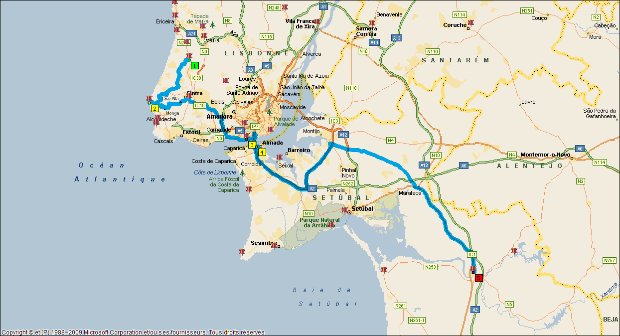 Départ D'ODRINHAS vers 9h30 sous la pluie et avec du vent. La journée s'annonce mal niveau temps. Tant pis, direction quand même pour le Cabo Da Roca, pointe la plus à l'ouest de l'Europe. Au fur et à mesure que nous approchons, le vent s'intensifie. Quand nous parvenons au pied du phare c'est une véritable tempête qui nous accueille. Malgré ce temps, des bus de touristes sont présents. Il y a tellement de vent que la pluie nous cingle. Nous ne pouvons voir la falaise tellement c'est bouché. Il fait tellement mauvais que nous n'avons même pas la possibilité d'aller récupérer le certificat qui atteste de notre venue sur ce site comme nous avions pu l'effectuer l'année dernière au CAP NORD. Il est vrai que ce lieu est beaucoup moins mytique que le CAP NORD. Après avoir pris quelques photos, nous partons direction LISBONNE, le quartier de la Tour de Bélem et Christ Roi, statue du Christ à l'identique de celle de RIO de JANEIRO mais surplombant le Tage. Le temps est toujours aussi mauvais. Aussi nous préférons rejoindre notre lieu de bivouac, un camping à ALCACER DO SAL. Nous prenons tout de même des photos de la tour de Bélem, et du pont sur le Tage où la conduite demande beaucoup d'attention du fait du mauvais temps. Au passage, le Christ Roi apparaît et nous le prenons lui aussi en photo. Nous terminons cette journée particulièrement pluvieuse en espérant que celle de demain sera meilleure.
