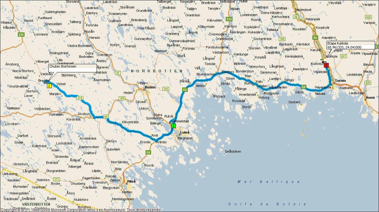 Pour le retour, nous reprenons la même route, direction Haparanda la ville frontalière avec la Finlande. Arrives à Haparanda nous continuons sur 10km en remontant le long de la rivière Kukkolaforsen, rivière tumultueuse qui sépare la Sud de de la Finlande, jusqu'au chutes de Kukola, bien moins impressionnantes que celles de Storfosen.