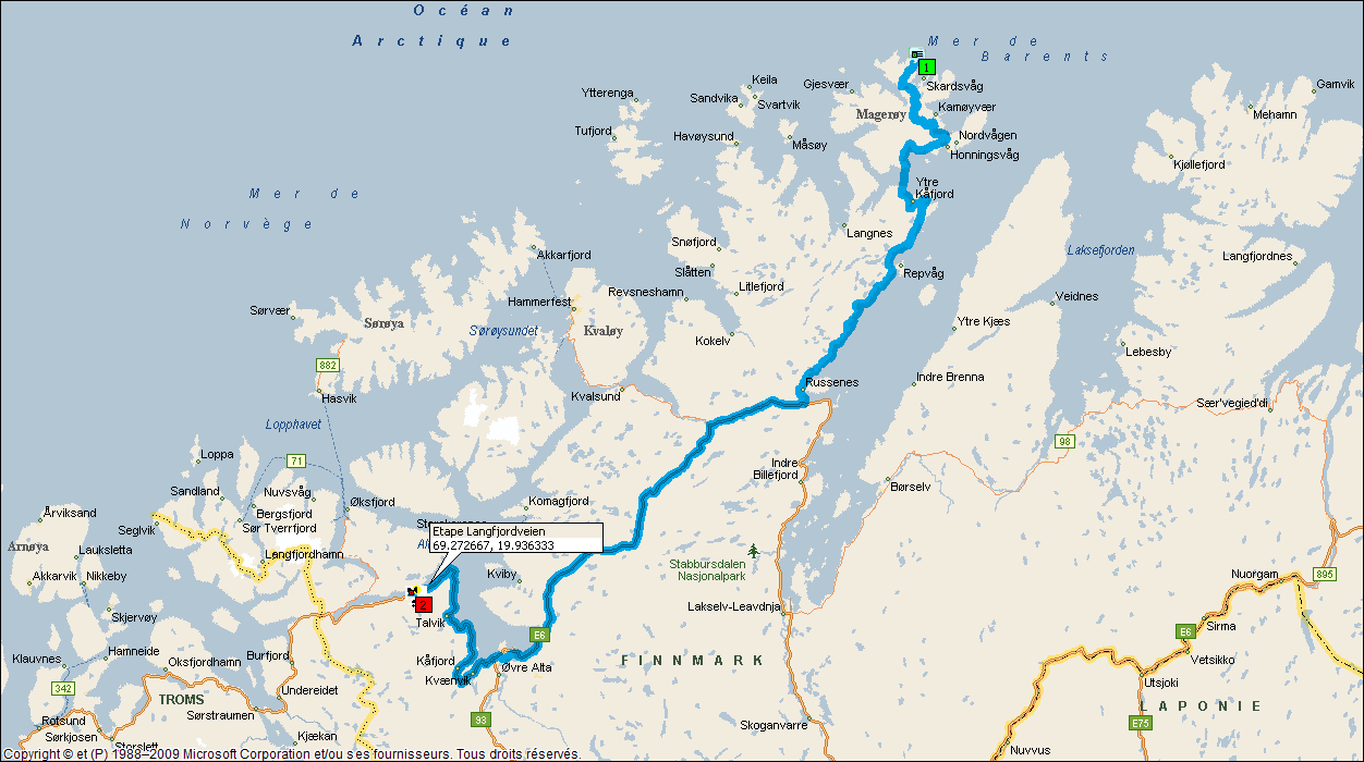 Nous entamons aujourd'hui notre descente vers les îles. Direction Alta. Nous partons à 9 h 30. Après seulement 2 kms, plus de brouillard. La route que nous avons empruntée l'avant veille nous parait moins longue sans le mauvais temps.