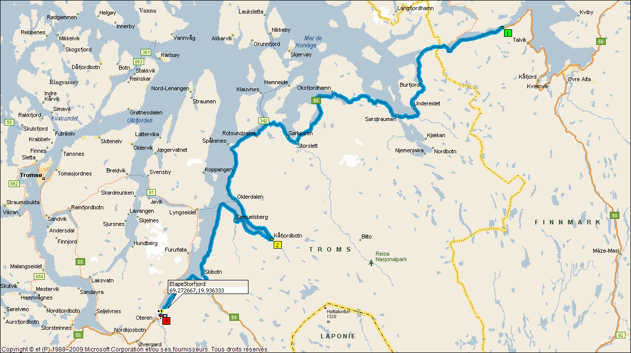 Nous nous avancons un peu pour demain et nous nous installons finalement pour la nuit pres d'un fjord, a STORFJORD . Demain matin nous irons visiter Tromso et nous serons fins prêts pour aller sur l'ile de Sommaroy.