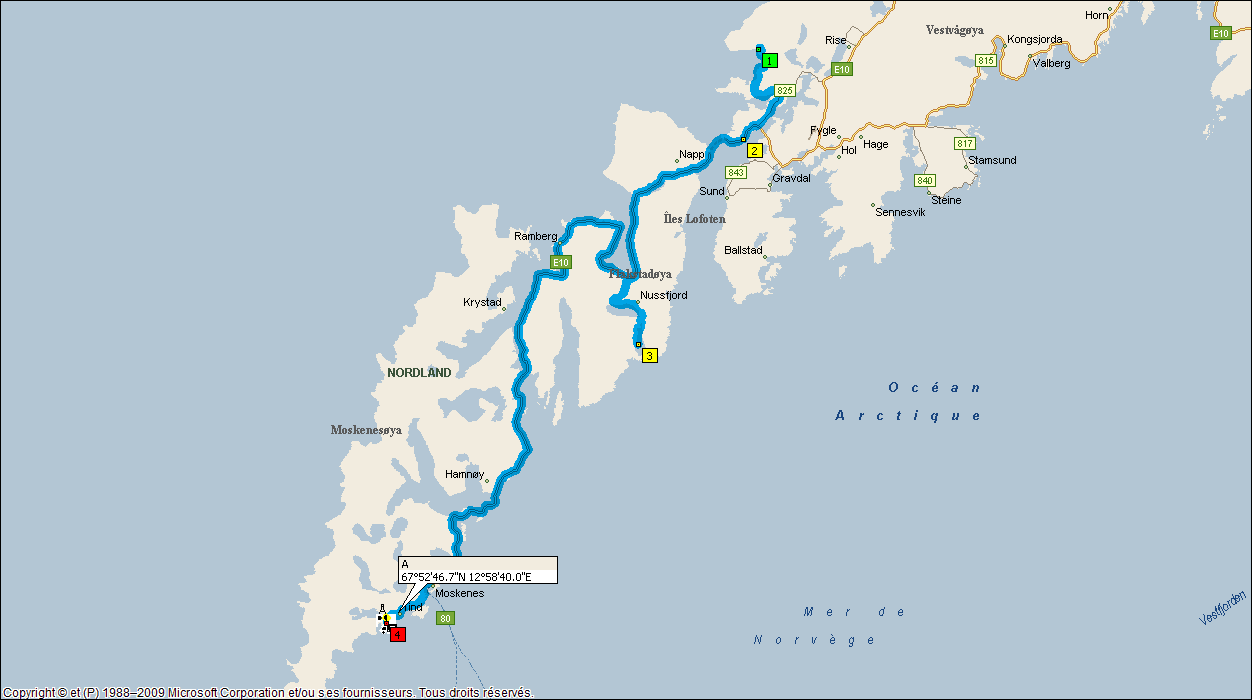 Lorsque nous partons, le temps s'est quelque peu eclairci. Nous pouvons enfin admirer la magnifique plage prés de laquelle nous avons dormi. Le brouillard s'est aussi enfin levé, et même si la pluie tombe par intermittence, nous decouvrons petit à petit le paysage. La beauté des îles Lofoten se dévoile tout doucement. Quel dommage que le soleil ne soit pas de la partie. Mais ne nous plaignons pas a cote d'hier c'est super.