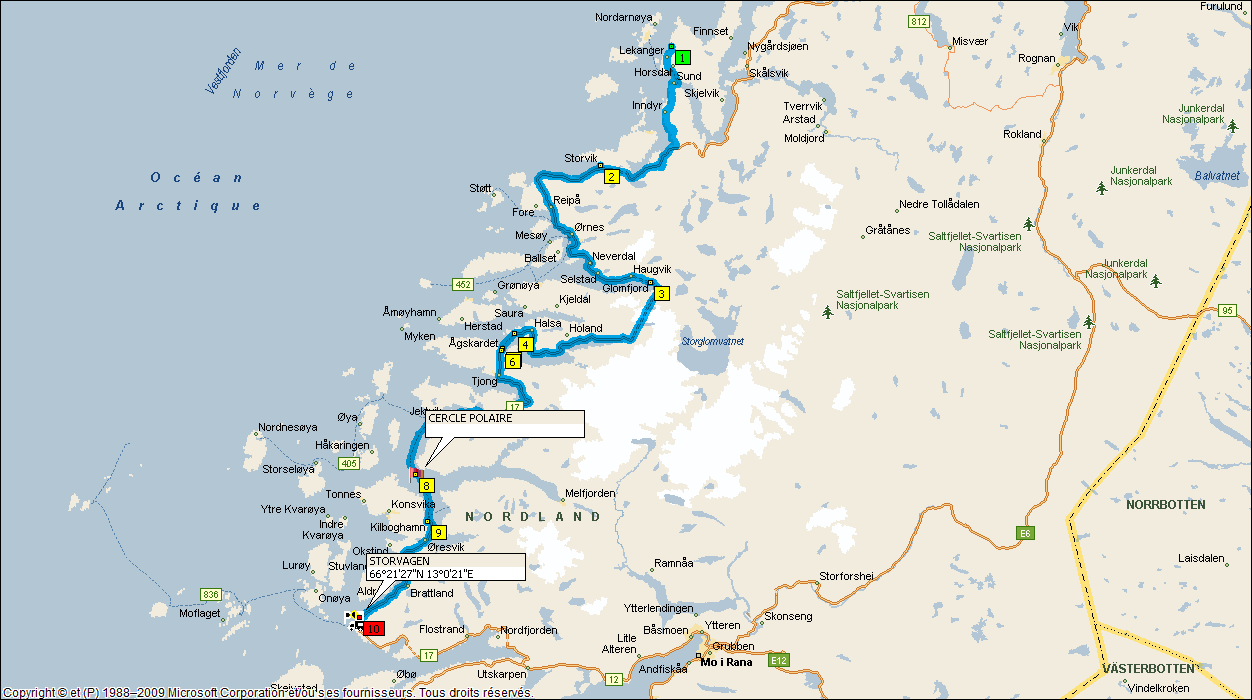 Nous montons au salon et retrouvons parmi les passagers un couple en camping car de Gironde, rencontres à A et très symphatiques. Durant la traversée, nous repasserons sous le cercle polaire franchi le 22 mai dernier. Un globe ressemblant à celui du Cap Nord est placé en bordure du fjord pour matérialiser le passage. Cela nous fait tout drole. Le temps est toujours très incertain mais permet de voir la beauté du fjord que nous traversons.