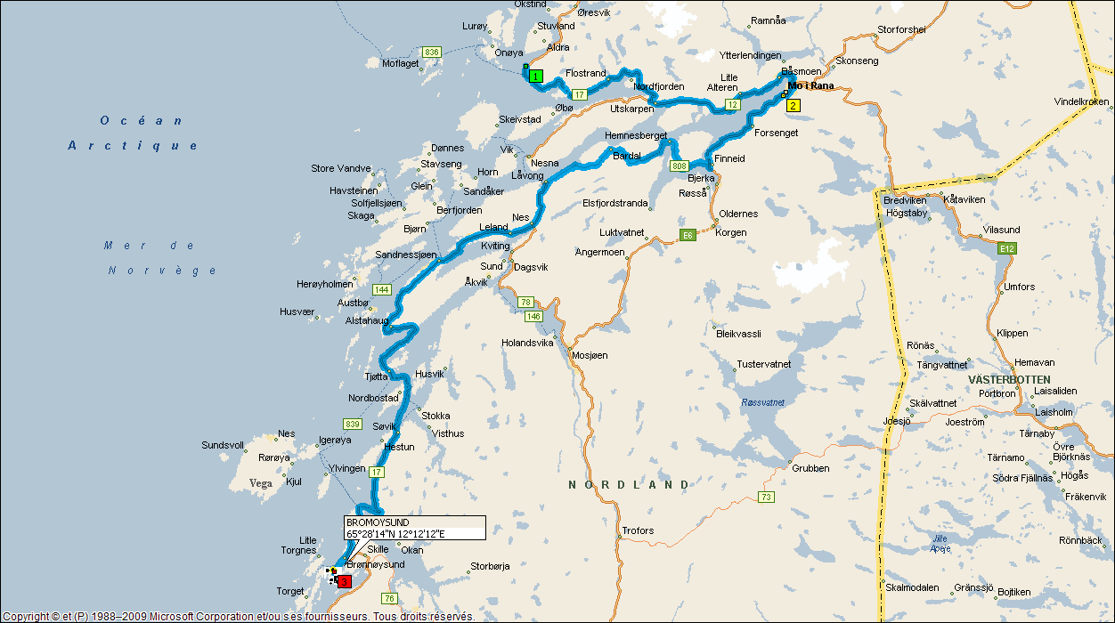 Lorsque nous arrivons a Forvik, nous avons 12 kms pour récupérer le dernier ferry de la journée. Nous sommes les 1ers rentrés donc les 1ers sortis et nous ouvrons la marche presque tous les véhicules débarqués du ferry nous suivent. A Andelsvagen, le ferry est là, il nous attend. Après 15 min de traversée, nous rejoignons Bronnoysund, petit port où nous coucherons cette nuit.