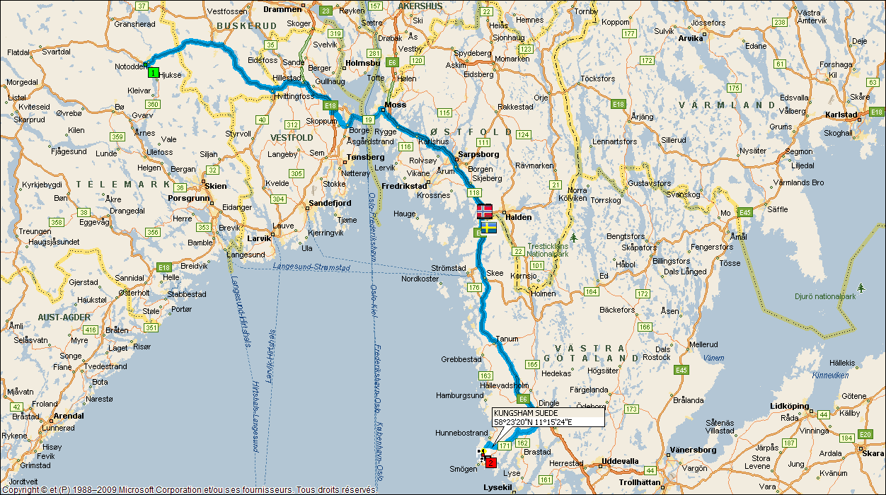Sitôt débarqué à Mos,direction la frontière. En arrivant au parking frontalier de Svinesund, nous nous arrêtons pour dépenser nos dernières couronnes. Ensuite, nous passons au bureau de détaxes des marchandises pour nous faire rembourser une partie des taxes perçues lors des achats en Norvège, en effets du fait que la Norvège ne fait pas partie de l'union européenne, ces taxes sont reversées à la sortie pour les non résidents.