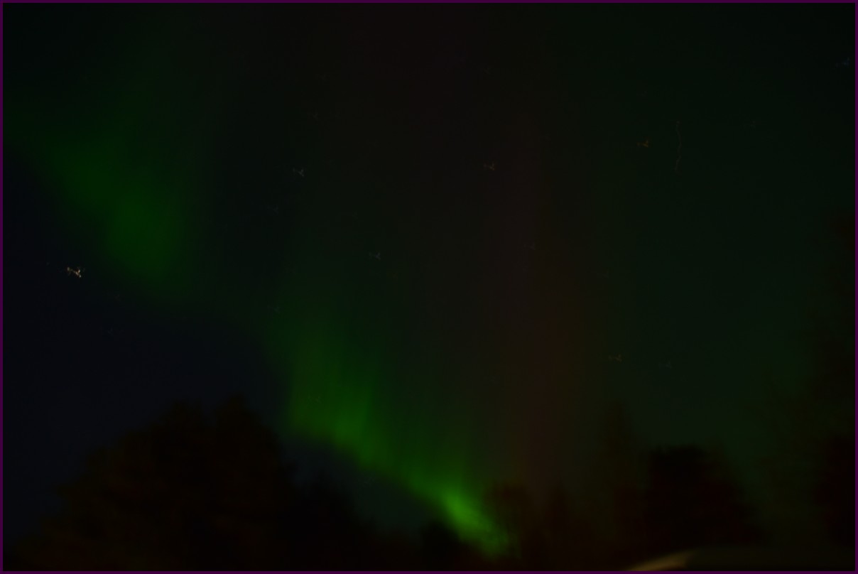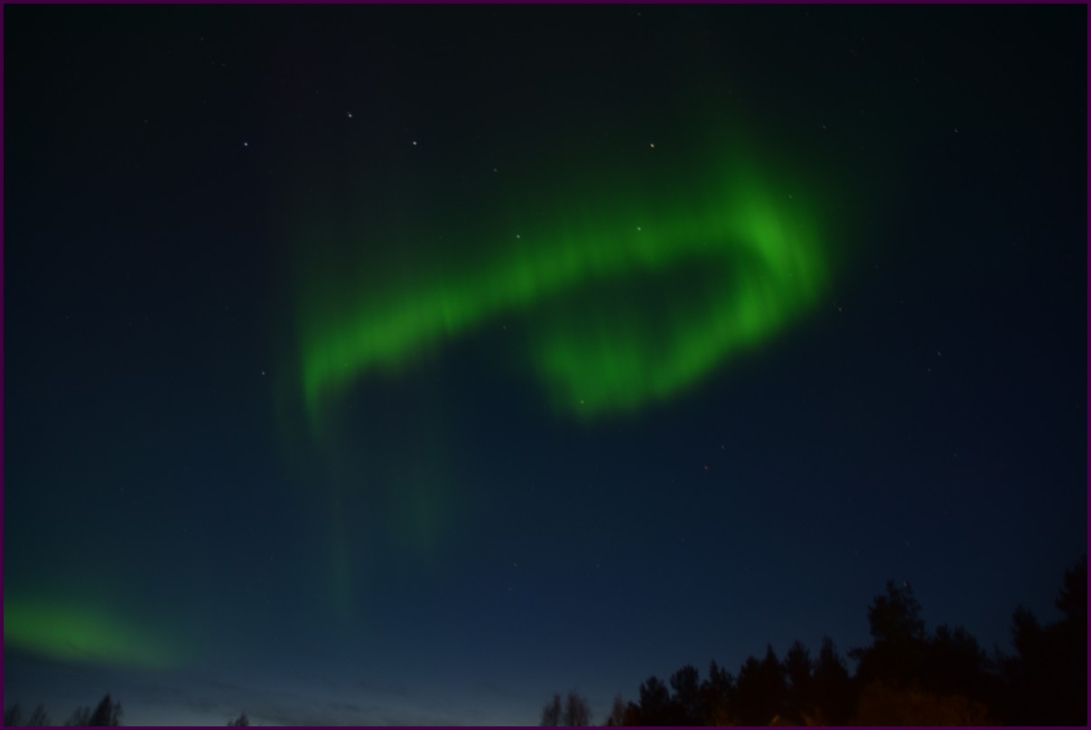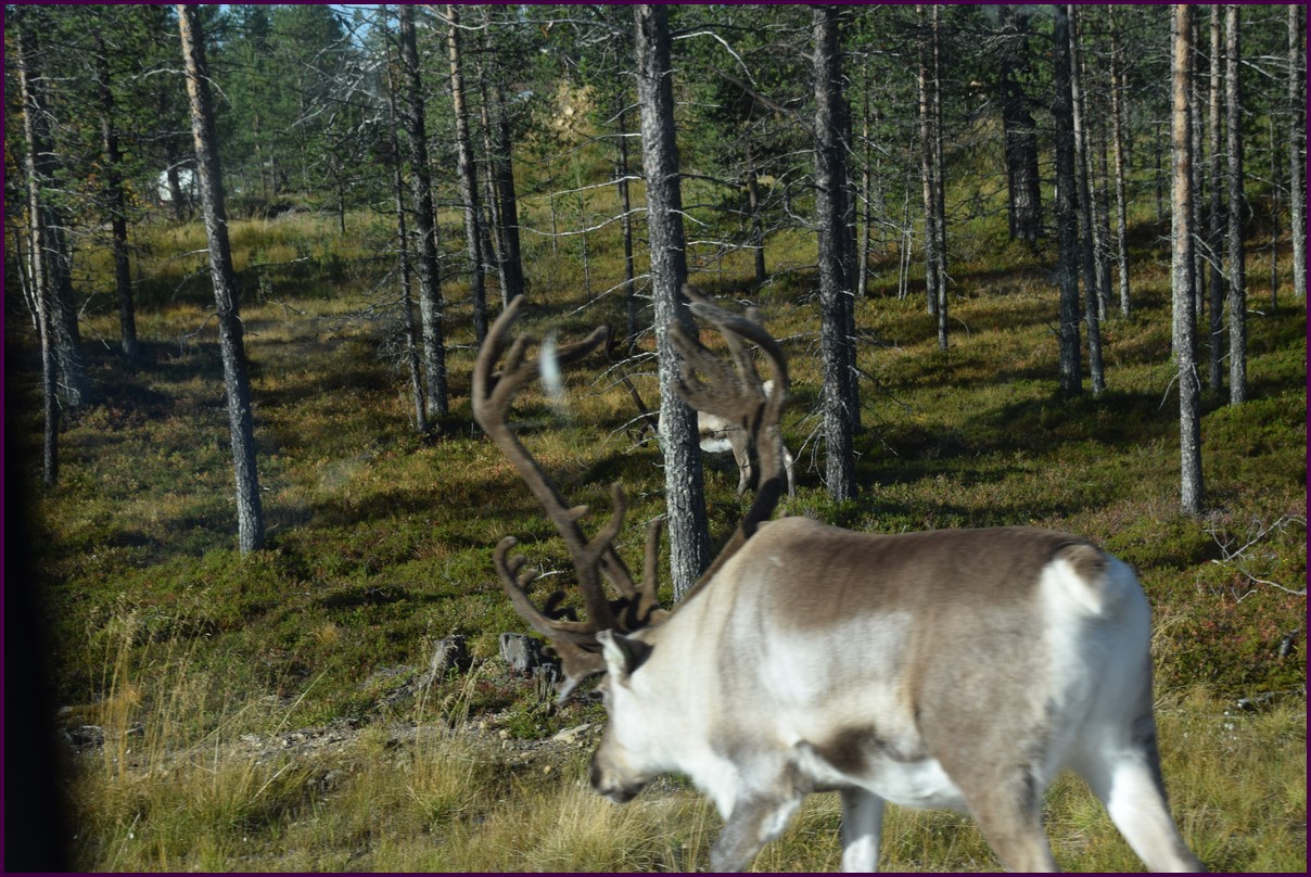 Ce matin il fait 0° autour de nous l'herbe est blanche, nous ne monterons pas plus haut en Finlande, après avoir étudié la météo pour ce soir, nous decidons de redescendres vers le "sud-ouest" de la Finlande un peu au dessus de la frontière avec la Suède. Sur notre route toujours beaucoup de lacs immense, nous rencontrons également des rennes, certains se tiennent tranquillement au milieu de la route. La nuit s'annonce froide alors camping pour l'électricité et le chauffage. Nous avons bien calculé vers 21h30, la danse commence dans le ciel. Les aurores apparaissent de tous les cötés pendant plus d'une heure, malheureusement l'intensité est moyenne mais c'est quand même un spectacle magique. Vers 23h on se réfugie dans le camping-car deors il fait -2° ça commence à serrer.
