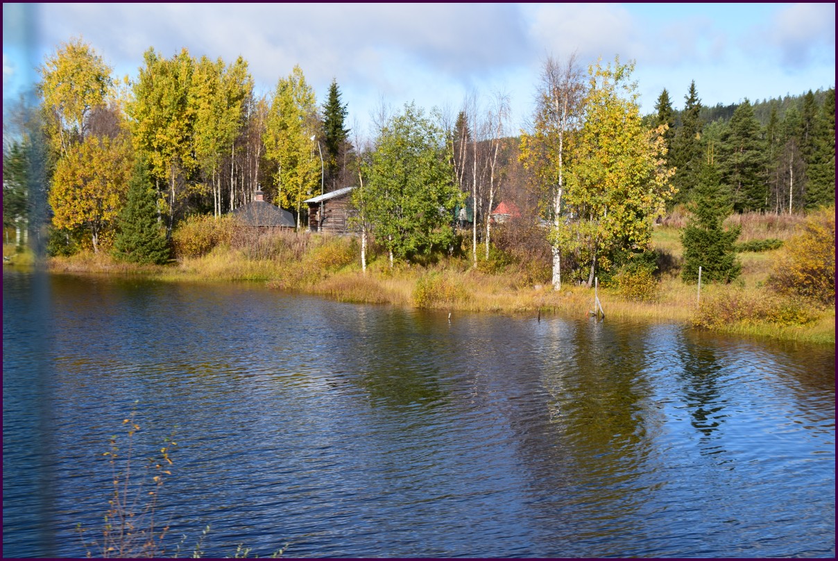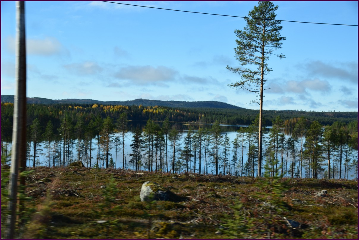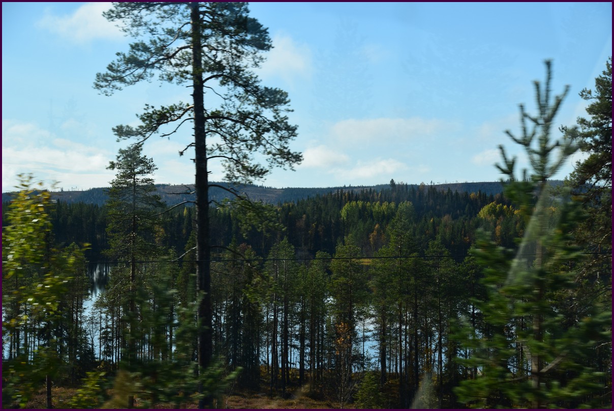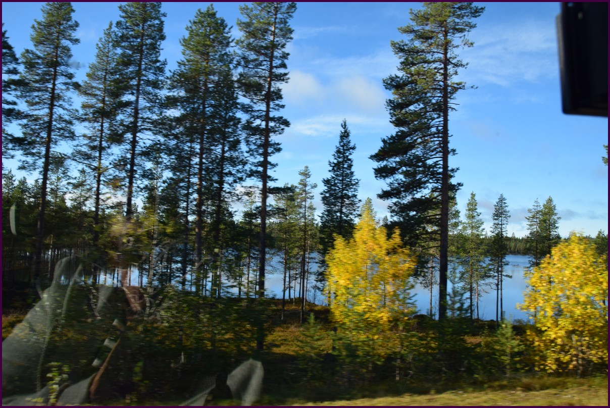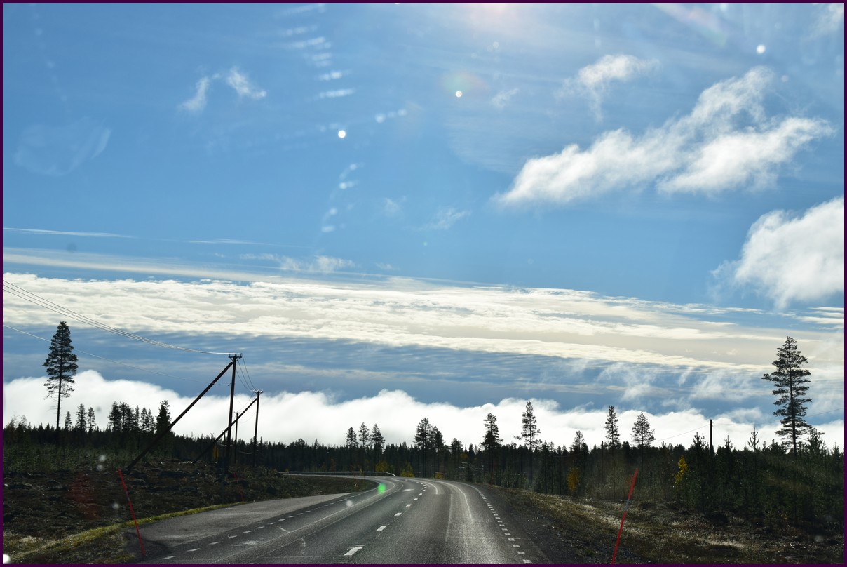 Toujours pas d'aurores cette nuit,nous décidons de prendre la route du retour par petites étapes. Ce matin,il fait 1° et il y a un épais brouillard. Nous reprenons la route au milieu des forêts de sapin à perte de vue, la circulation est pratiquement nulle nous croisons une voiture tous les 10 km en moyenne, on peu rouler tranquille. Le brouillard fini par se lever pour laisser place à un beau soleil, mais la tempèrature ne dépasse pas le 7°. Nous décidons de nous arrêter après 250 km on est pas pressé et nous caressons toujours l'espoir que les aurores viendront nous saluer.