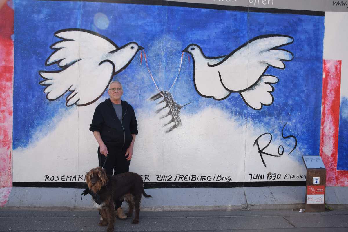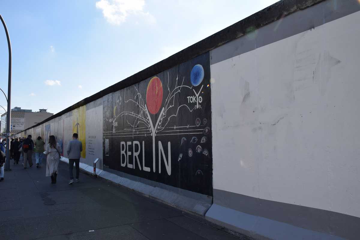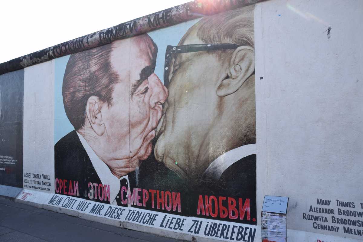 Départ KARL MARX ALLEE nous descendons toute l'avenue de nombreux batiments rappelle par leur architecture l'époque soviètique, mais parait il c'est un des quartiers le plus prisé de Berlin. Nous arrivons à l' East Side Gallery c'est une portion du mur de 1km3 où de nombreux artistes sont venus exprimer leur talent.