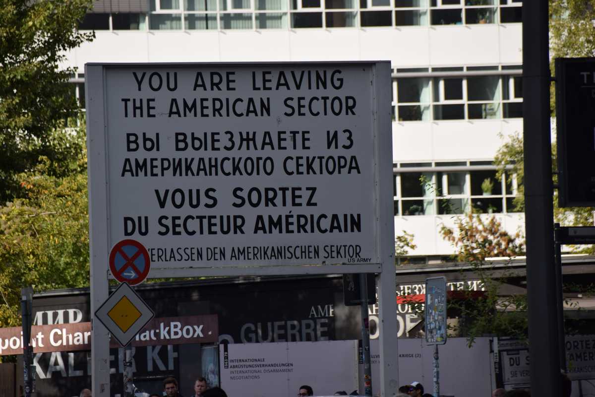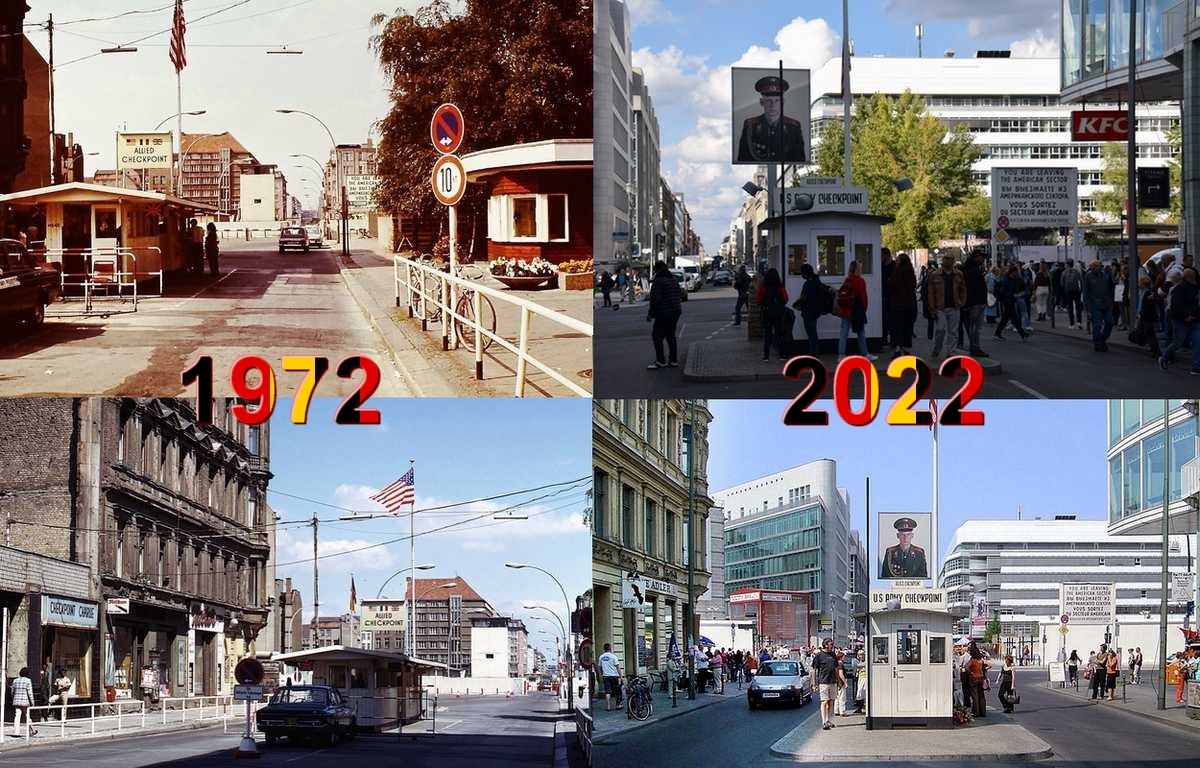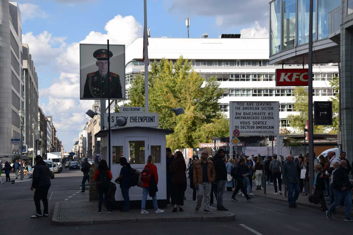 Nous reprenons le bus qui nous fait faire le tour de la ville nous repassons devant la Porte de Brandebourg, le Reichstag, nous faisons le tour de la colonne de la victoire, le chateau de BELLEVUE domicile du président, nous arrivons à CHECK POINT CHARLIE. Petite surprise, il reste bien la guérite Américaine au milieu de la rue où c'est la ruée des photographes (le piège à touriste!), un petit endroit à été aménagé avec deux morceaux du mur des photos de l'époque et un petit musée mais tout à été reconstruit et encore une fois il est très difficile de se faire une idée de comment c'était à l'époque de la guerre froide.