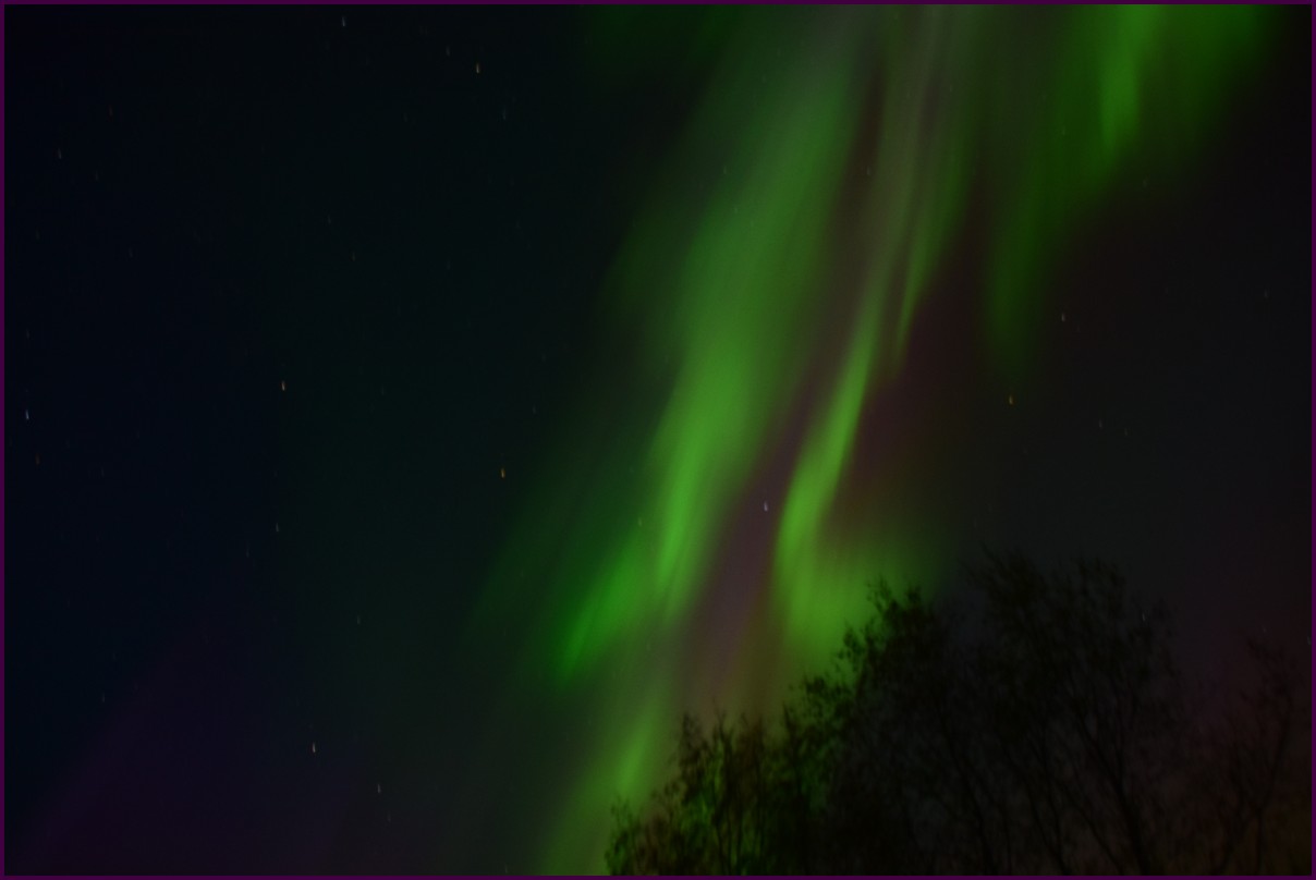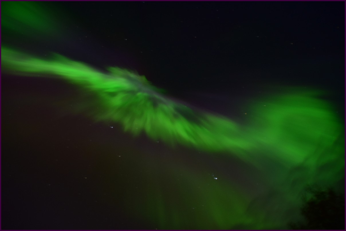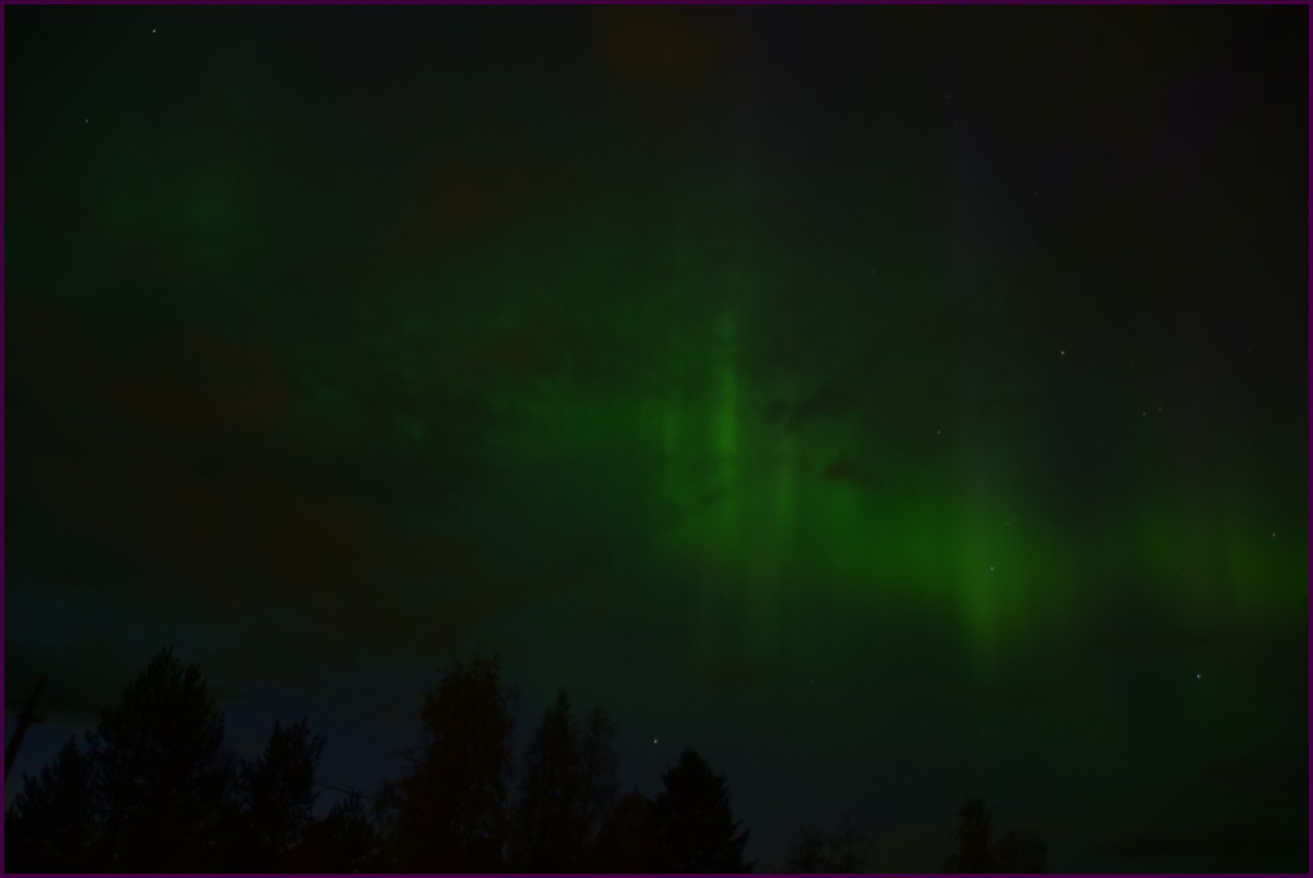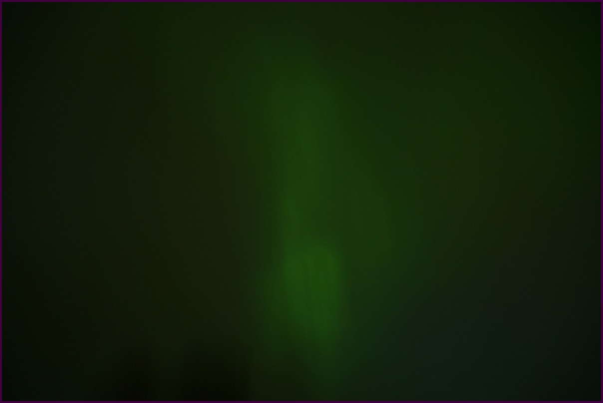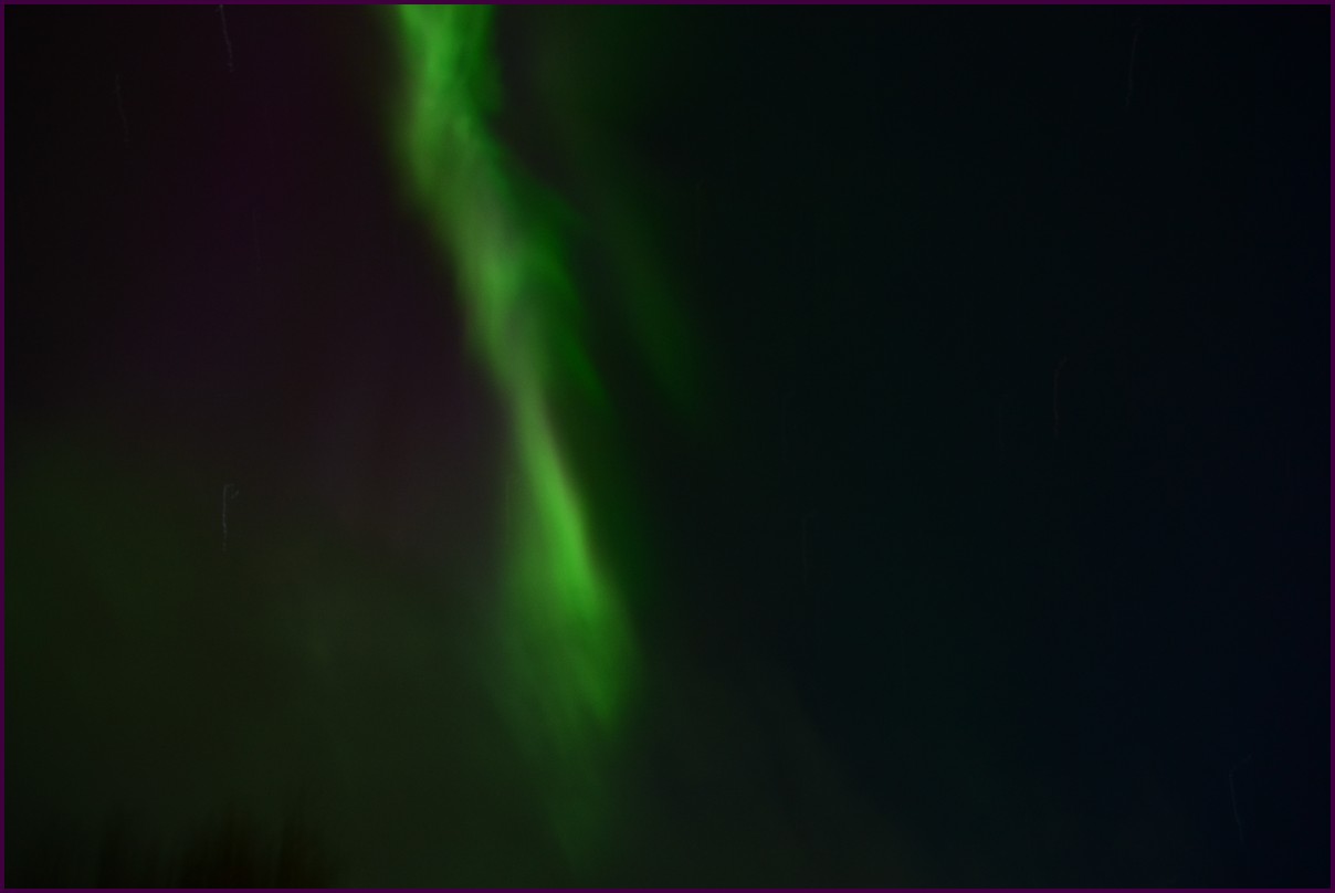 Aujourd'hui repos,lessive nous restons sur place. La soirée est annoncée avec de grosses aurores, mais les nuages et le vent sont là toute la journée. Vers 21h le ciel se dégage et à 22h, les premières lueurs verte apparaissent à l'horizon. D'un seul coup tout s'amplifie le ciel devein vert et rouge ça explose de tout les côtés, le spectacle est fantastique, malheureusement, les nuages reviennent et mettent court au spectacle.