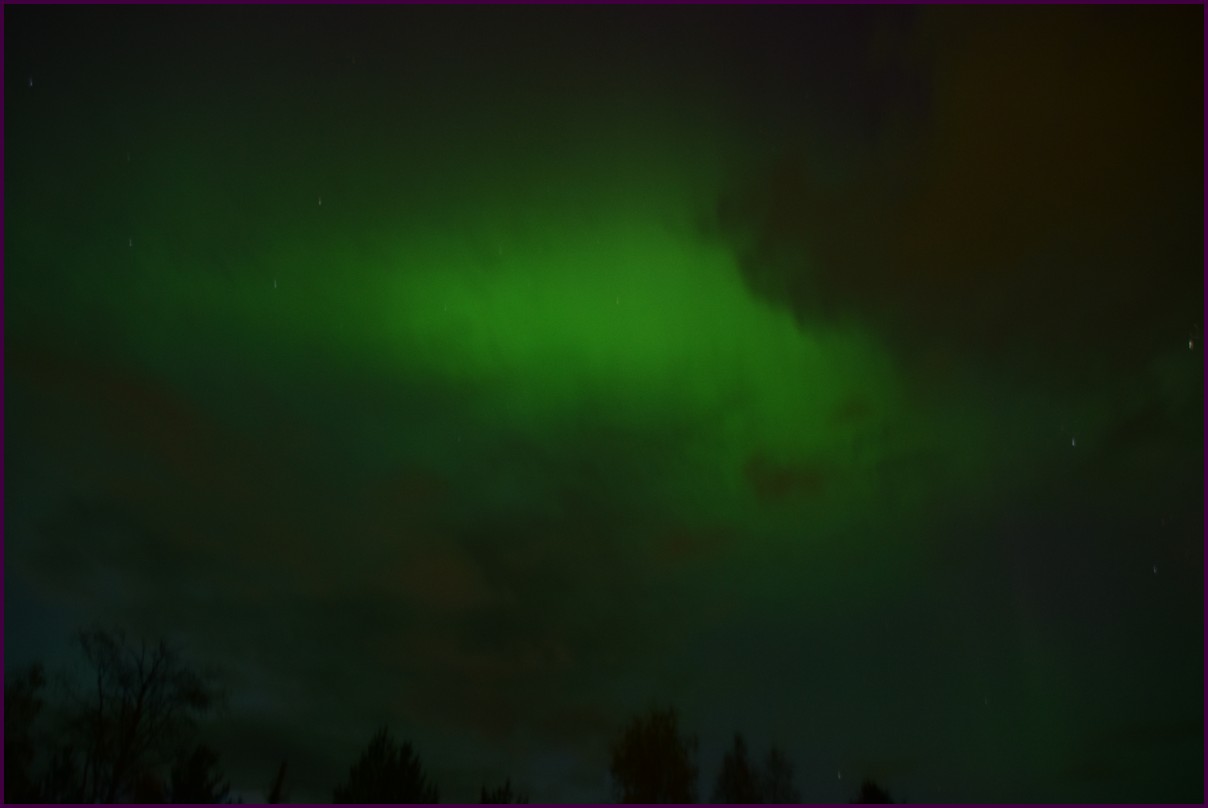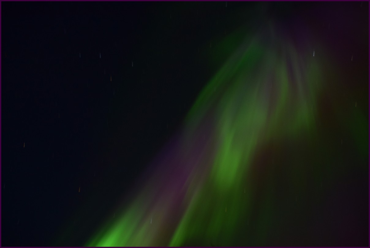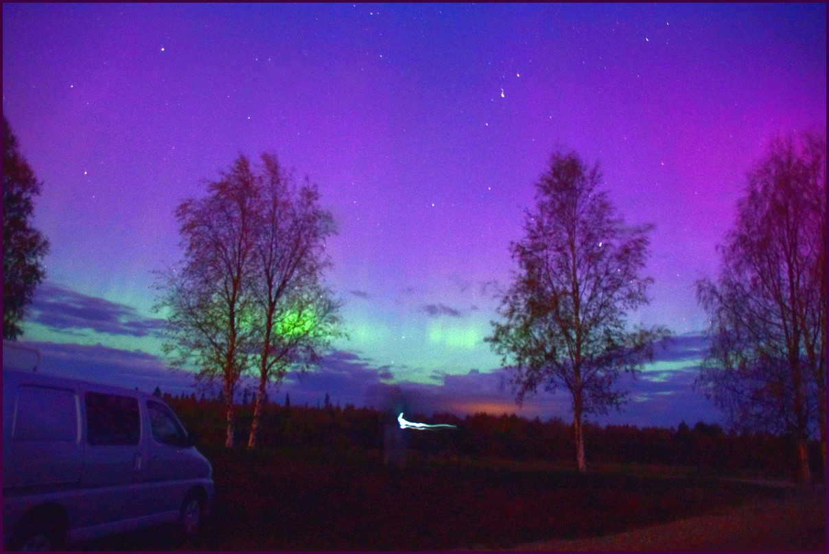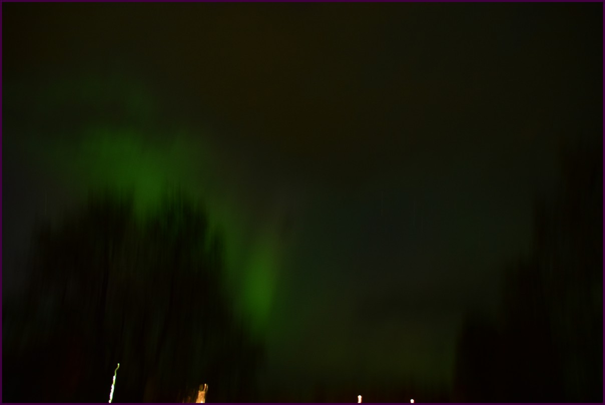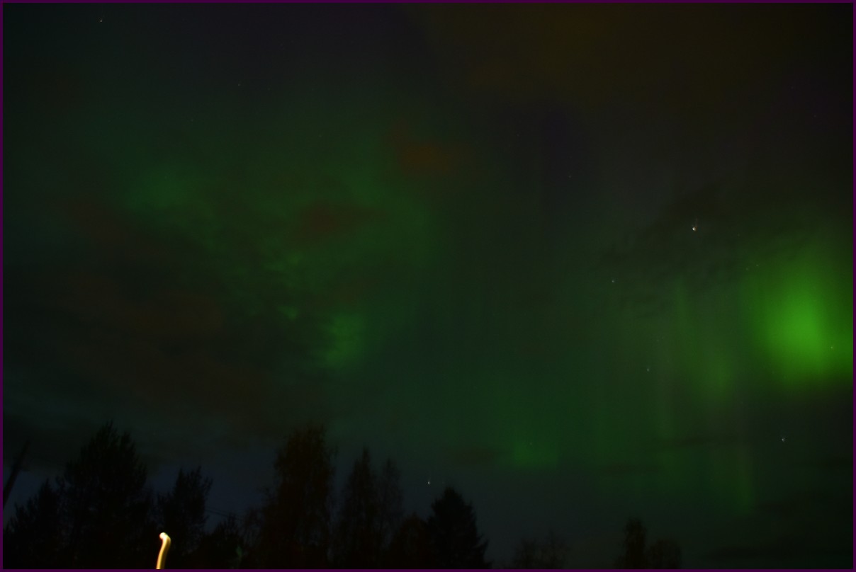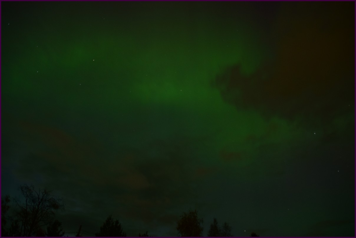 Aujourd'hui repos,lessive nous restons sur place. La soirée est annoncée avec de grosses aurores, mais les nuages et le vent sont là toute la journée. Vers 21h le ciel se dégage et à 22h, les premières lueurs verte apparaissent à l'horizon. D'un seul coup tout s'amplifie le ciel devein vert et rouge ça explose de tout les côtés, le spectacle est fantastique, malheureusement, les nuages reviennent et mettent court au spectacle.