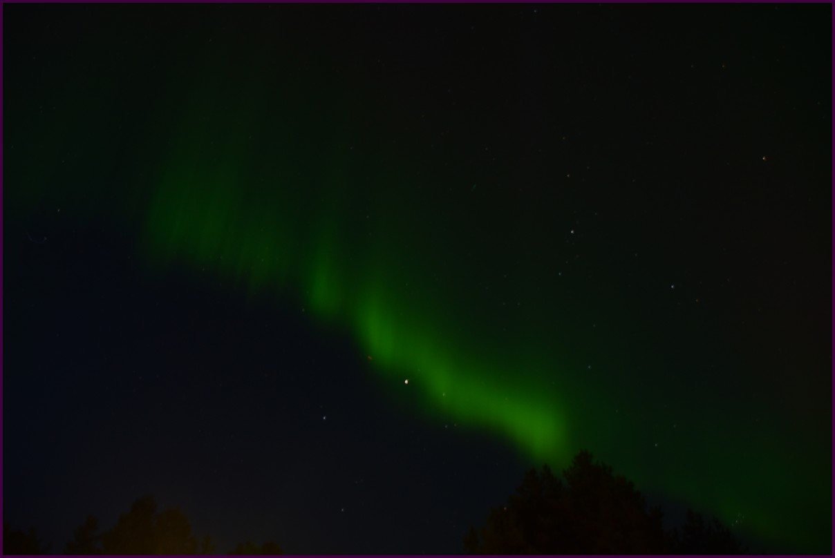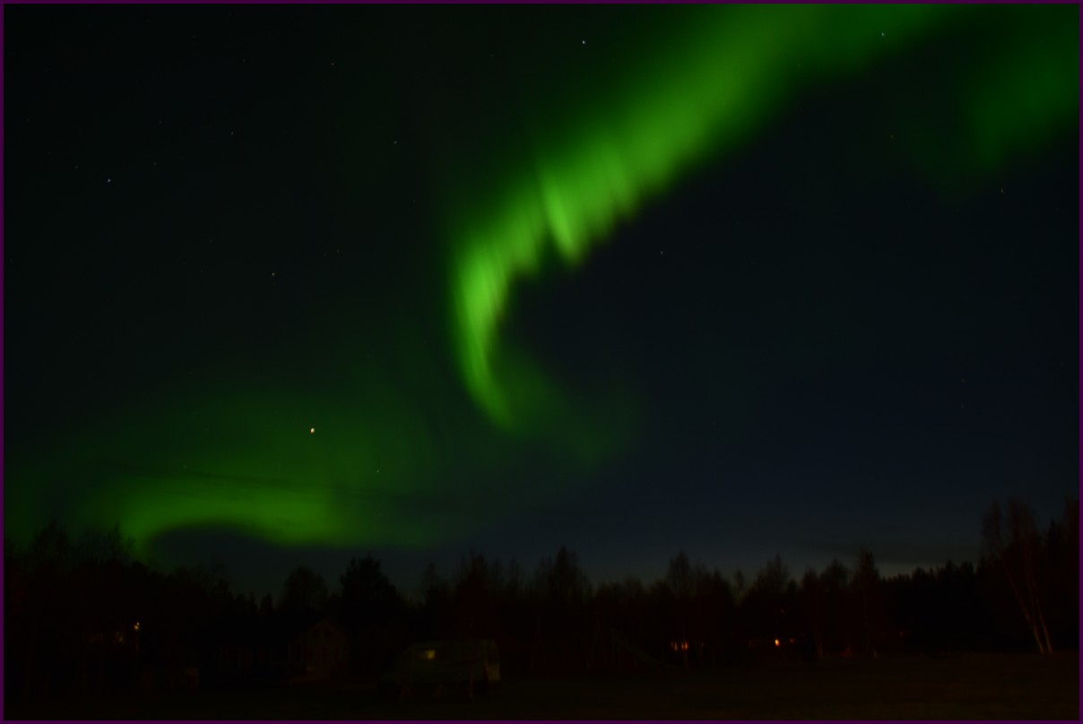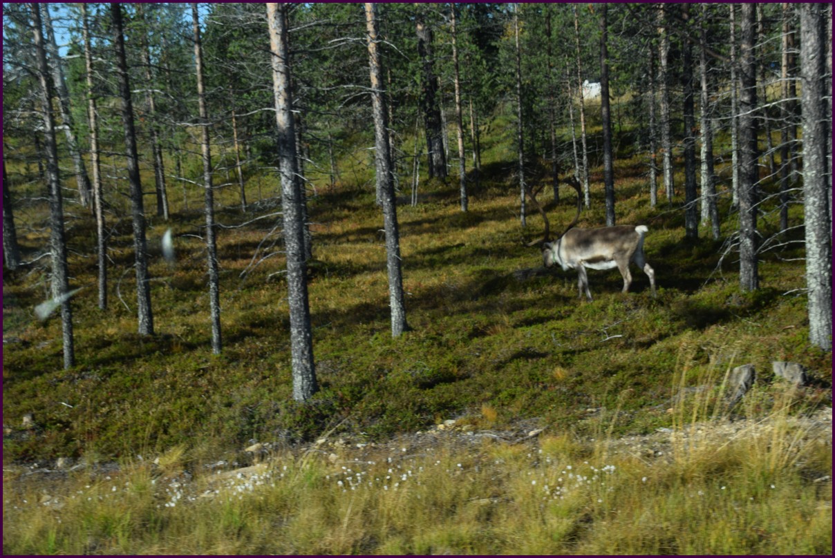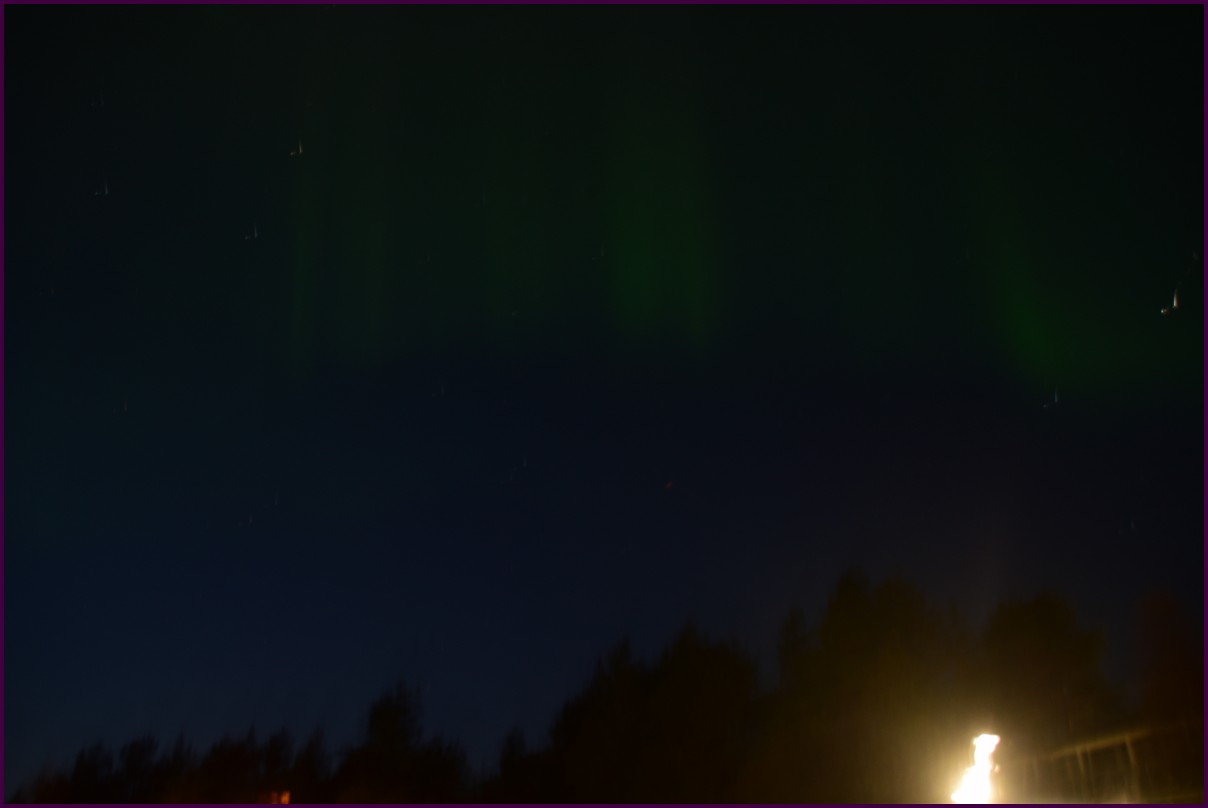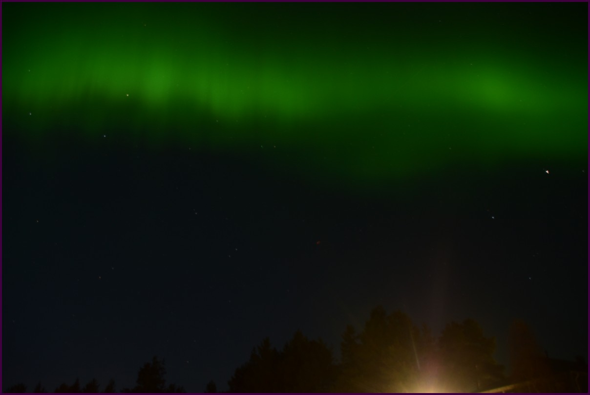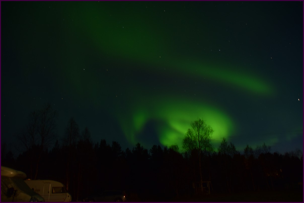 Ce matin il fait 0° autour de nous l'herbe est blanche, nous ne monterons pas plus haut en Finlande, après avoir étudié la météo pour ce soir, nous decidons de redescendres vers le "sud-ouest" de la Finlande un peu au dessus de la frontière avec la Suède. Sur notre route toujours beaucoup de lacs immense, nous rencontrons également des rennes, certains se tiennent tranquillement au milieu de la route. La nuit s'annonce froide alors camping pour l'électricité et le chauffage. Nous avons bien calculé vers 21h30, la danse commence dans le ciel. Les aurores apparaissent de tous les cötés pendant plus d'une heure, malheureusement l'intensité est moyenne mais c'est quand même un spectacle magique. Vers 23h on se réfugie dans le camping-car deors il fait -2° ça commence à serrer.
