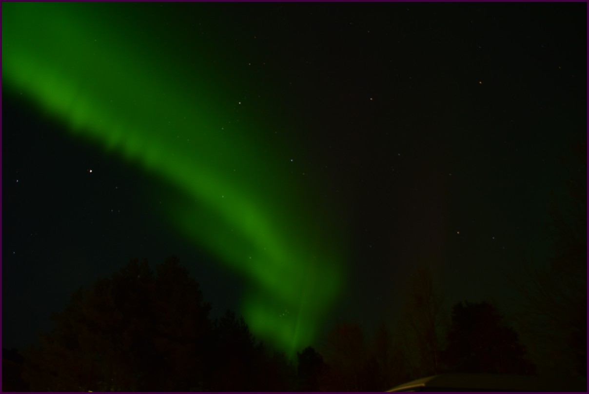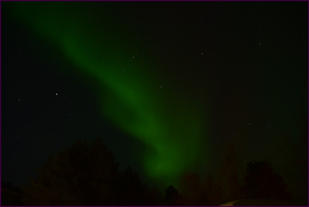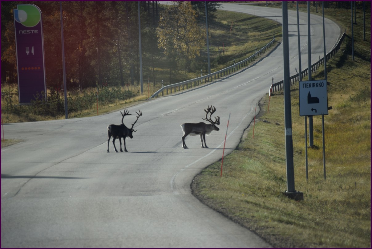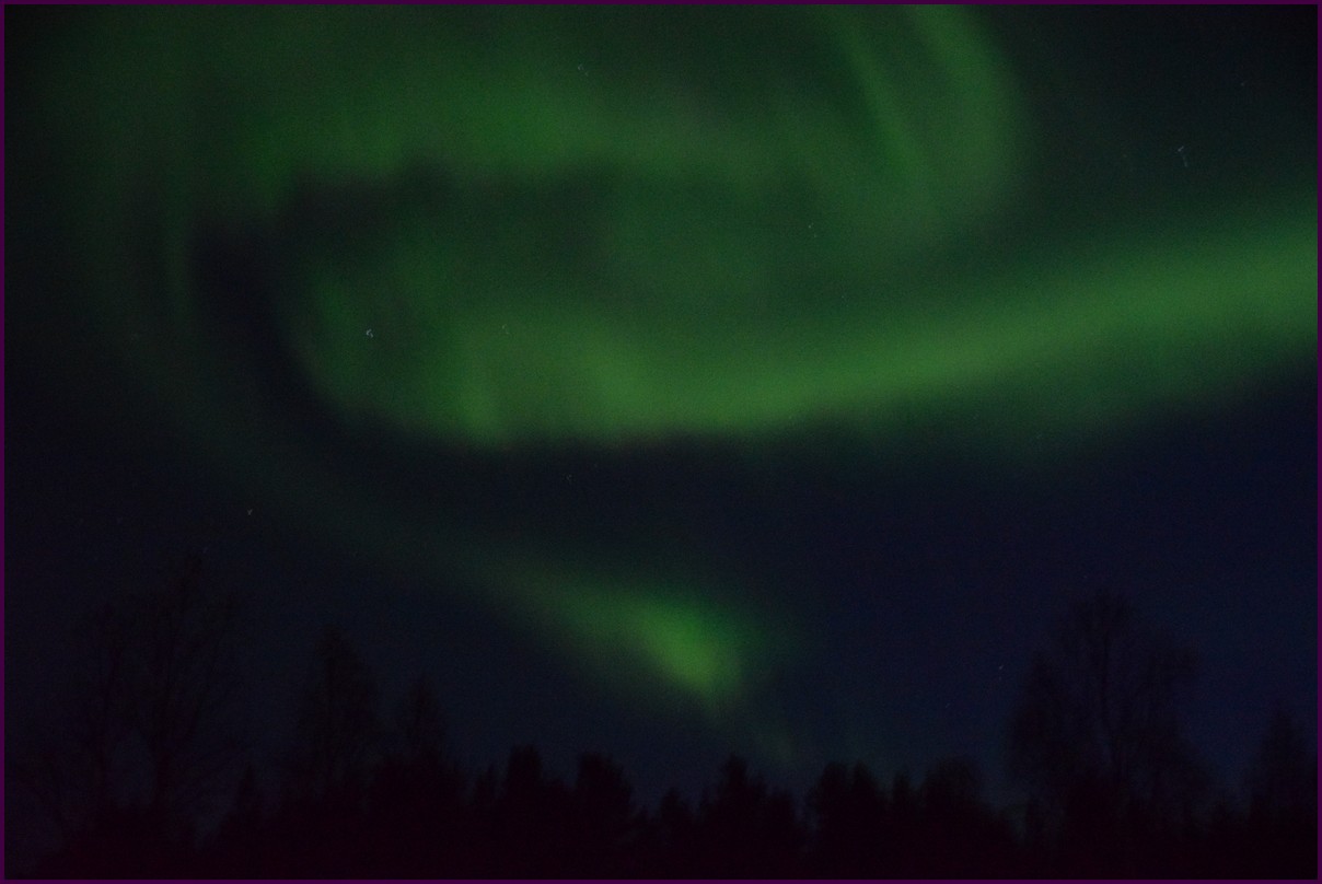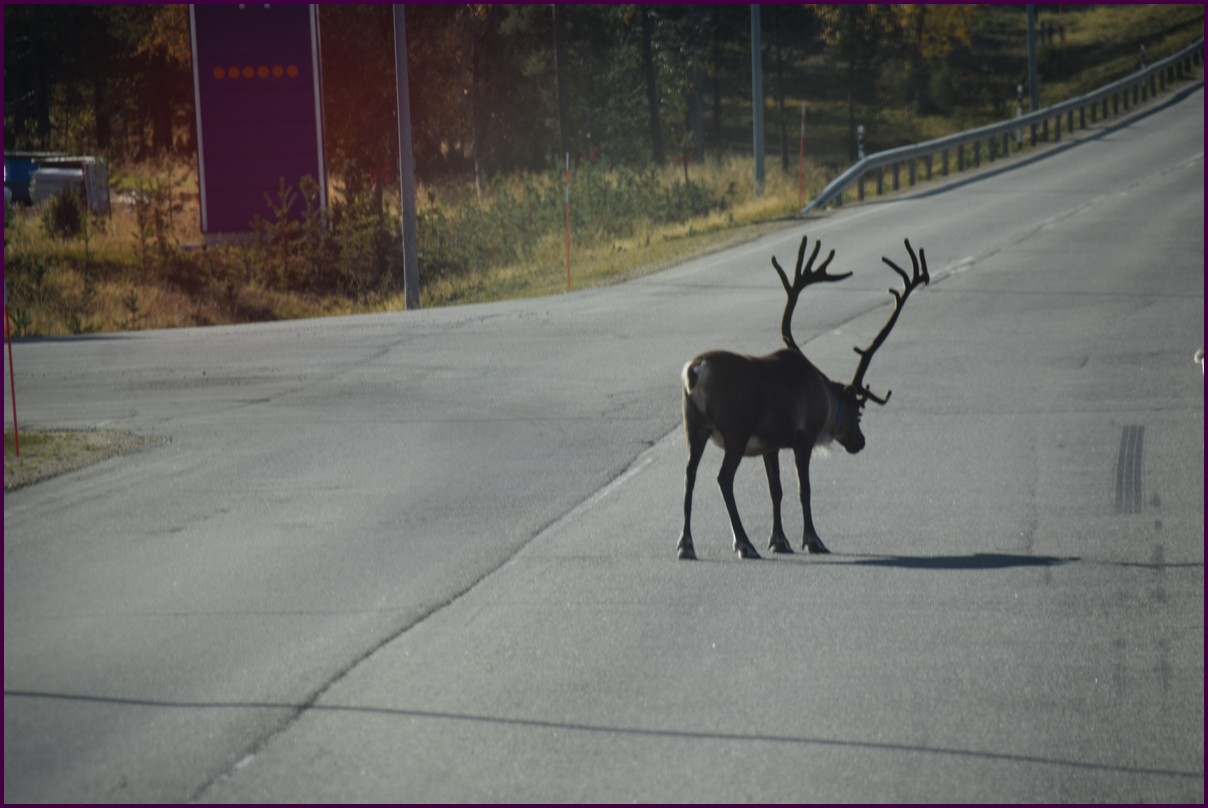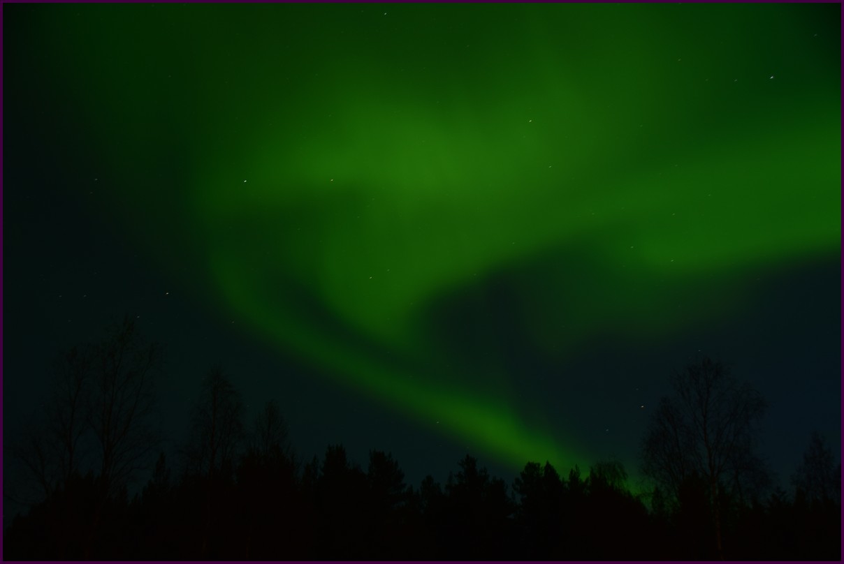 Ce matin il fait 0° autour de nous l'herbe est blanche, nous ne monterons pas plus haut en Finlande, après avoir étudié la météo pour ce soir, nous decidons de redescendres vers le "sud-ouest" de la Finlande un peu au dessus de la frontière avec la Suède. Sur notre route toujours beaucoup de lacs immense, nous rencontrons également des rennes, certains se tiennent tranquillement au milieu de la route. La nuit s'annonce froide alors camping pour l'électricité et le chauffage. Nous avons bien calculé vers 21h30, la danse commence dans le ciel. Les aurores apparaissent de tous les cötés pendant plus d'une heure, malheureusement l'intensité est moyenne mais c'est quand même un spectacle magique. Vers 23h on se réfugie dans le camping-car deors il fait -2° ça commence à serrer.
