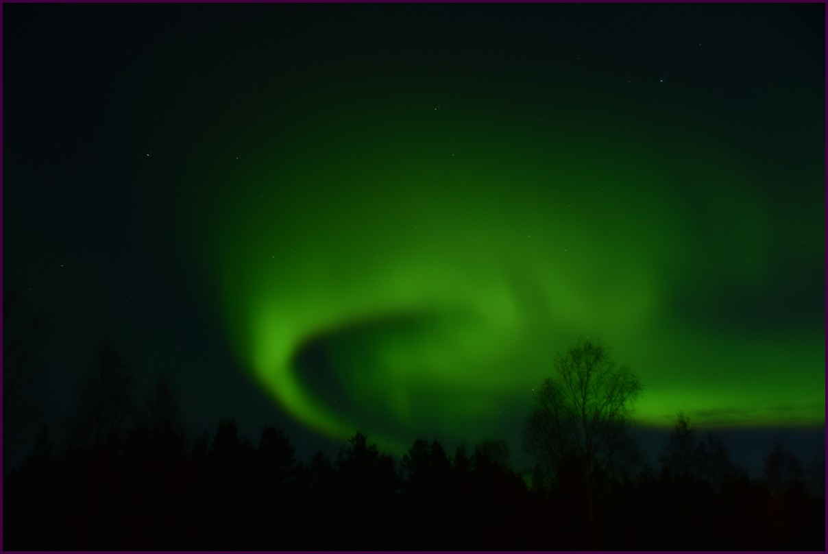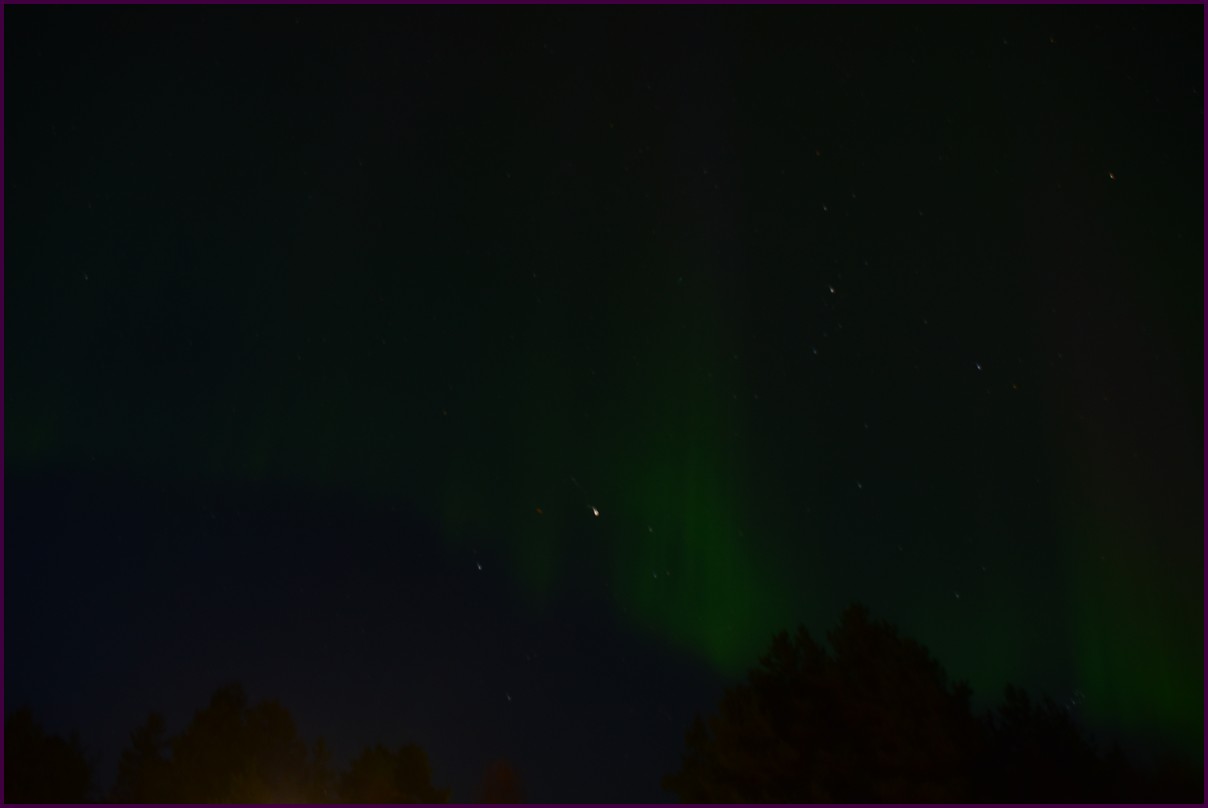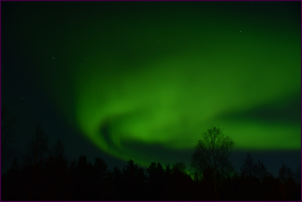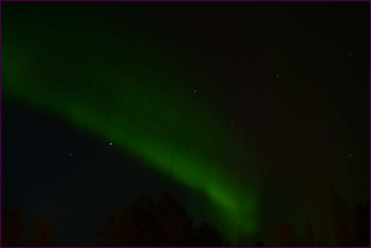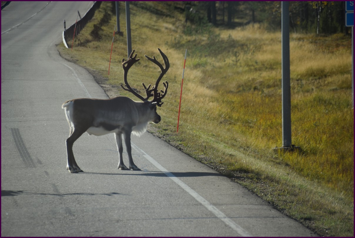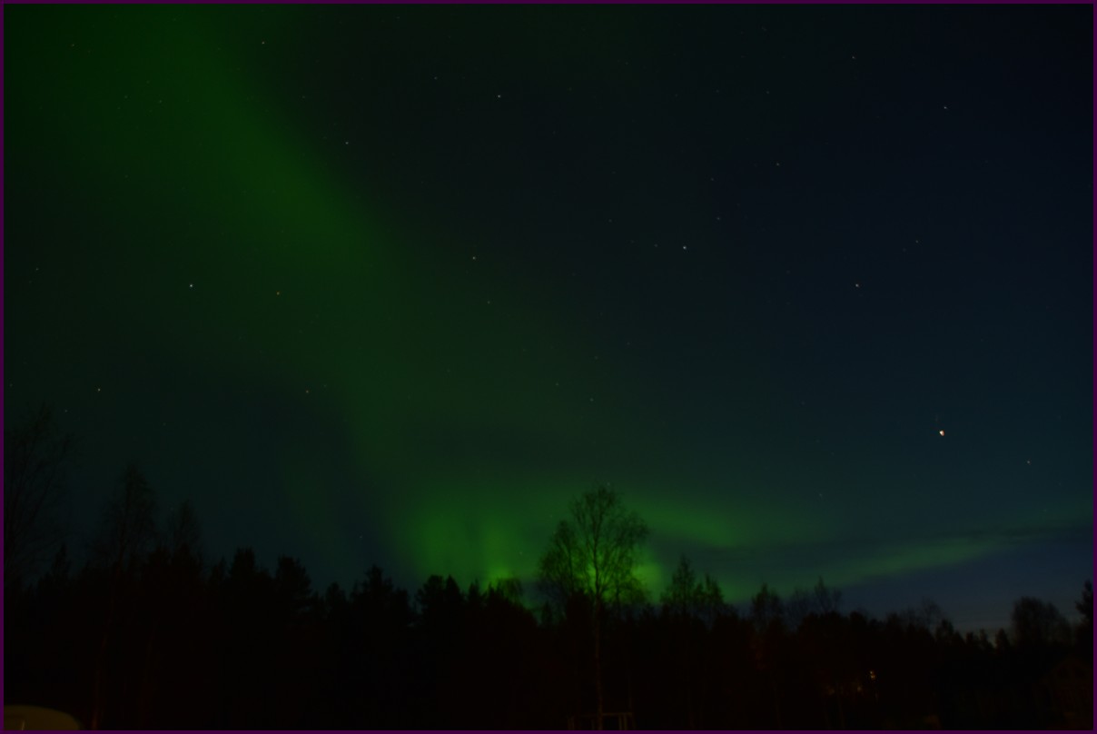 Ce matin il fait 0° autour de nous l'herbe est blanche, nous ne monterons pas plus haut en Finlande, après avoir étudié la météo pour ce soir, nous decidons de redescendres vers le "sud-ouest" de la Finlande un peu au dessus de la frontière avec la Suède. Sur notre route toujours beaucoup de lacs immense, nous rencontrons également des rennes, certains se tiennent tranquillement au milieu de la route. La nuit s'annonce froide alors camping pour l'électricité et le chauffage. Nous avons bien calculé vers 21h30, la danse commence dans le ciel. Les aurores apparaissent de tous les cötés pendant plus d'une heure, malheureusement l'intensité est moyenne mais c'est quand même un spectacle magique. Vers 23h on se réfugie dans le camping-car deors il fait -2° ça commence à serrer.
