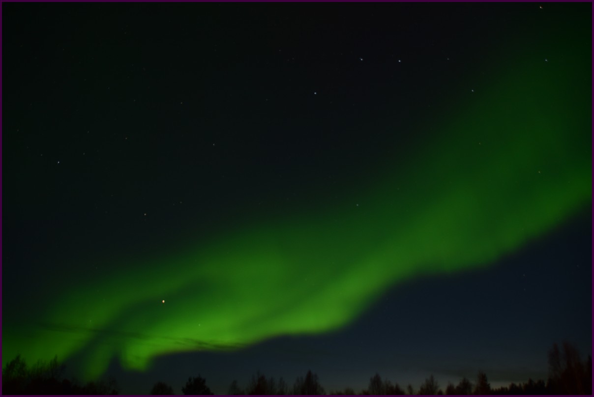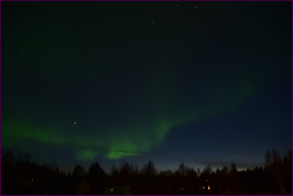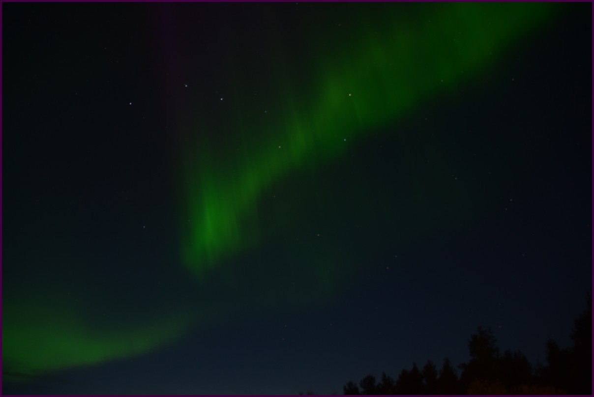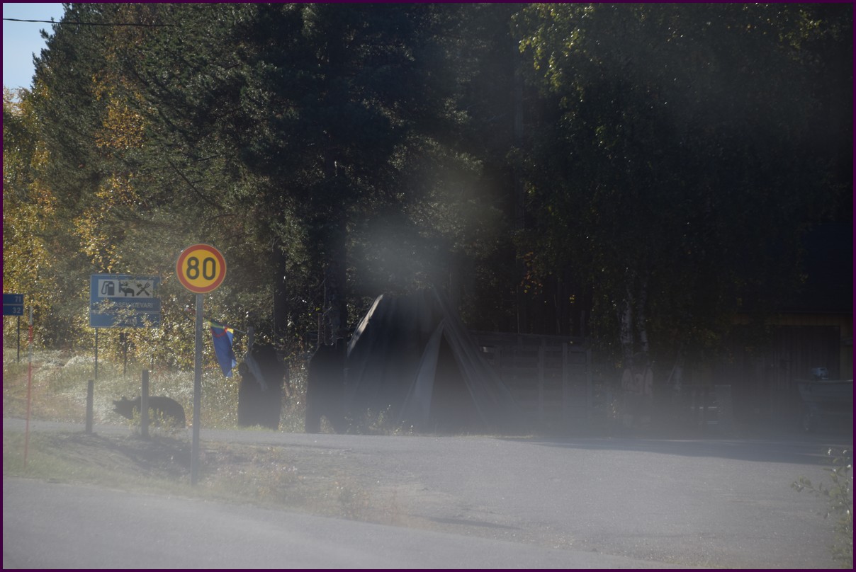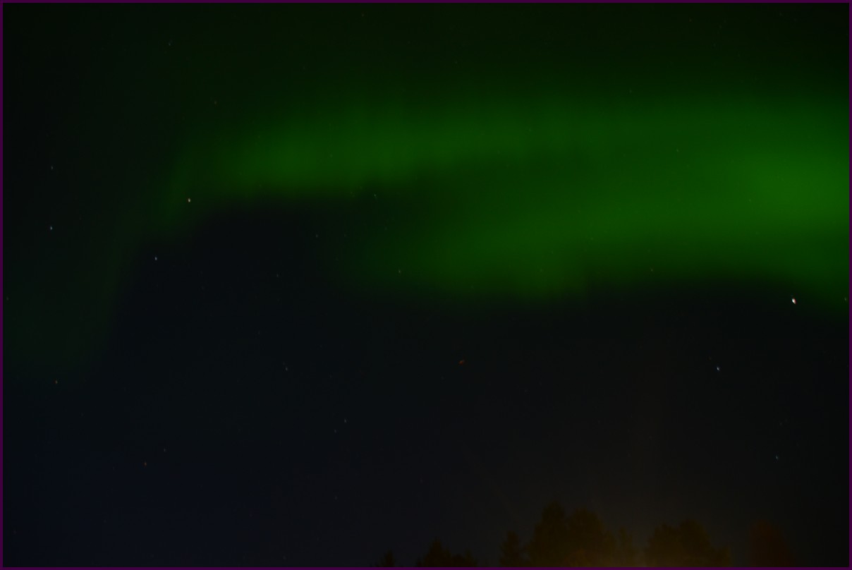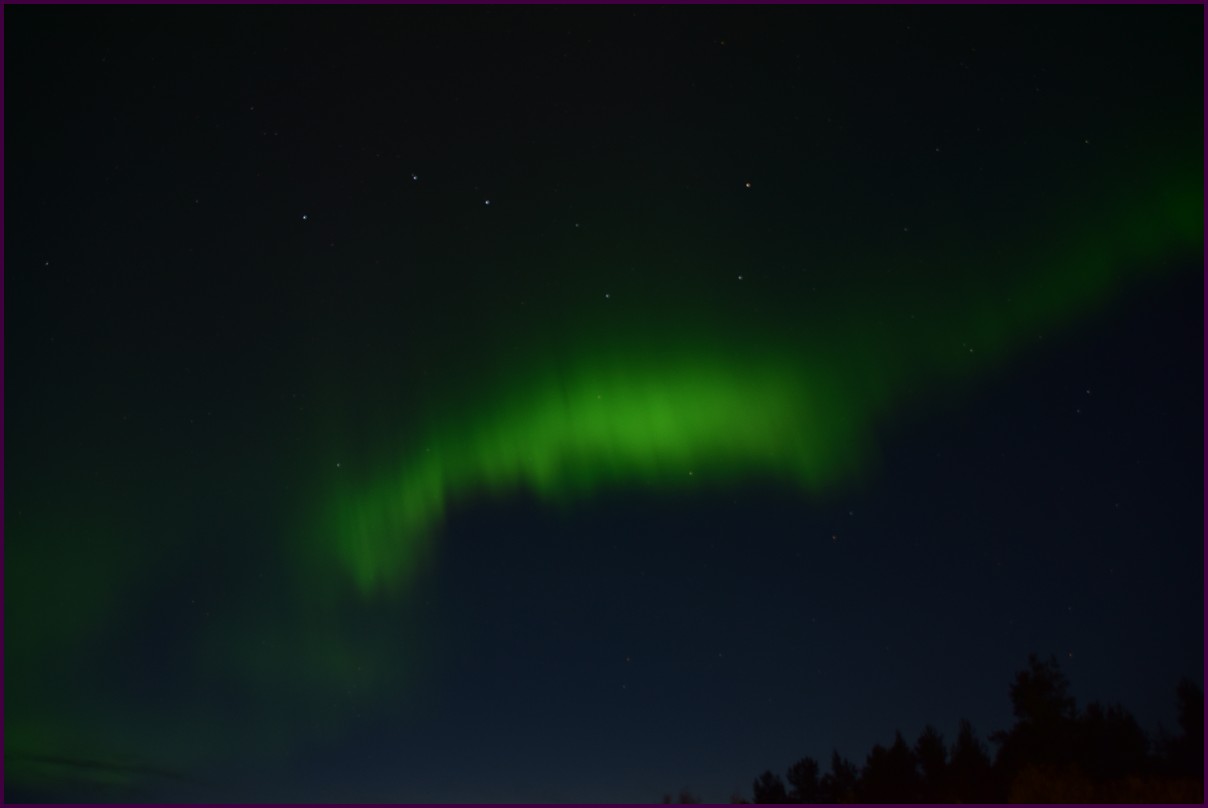 Ce matin il fait 0° autour de nous l'herbe est blanche, nous ne monterons pas plus haut en Finlande, après avoir étudié la météo pour ce soir, nous decidons de redescendres vers le "sud-ouest" de la Finlande un peu au dessus de la frontière avec la Suède. Sur notre route toujours beaucoup de lacs immense, nous rencontrons également des rennes, certains se tiennent tranquillement au milieu de la route. La nuit s'annonce froide alors camping pour l'électricité et le chauffage. Nous avons bien calculé vers 21h30, la danse commence dans le ciel. Les aurores apparaissent de tous les cötés pendant plus d'une heure, malheureusement l'intensité est moyenne mais c'est quand même un spectacle magique. Vers 23h on se réfugie dans le camping-car deors il fait -2° ça commence à serrer.