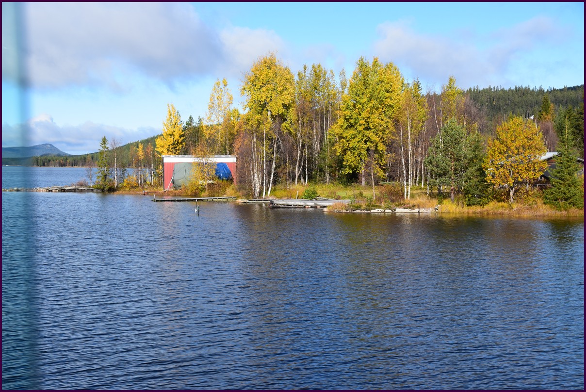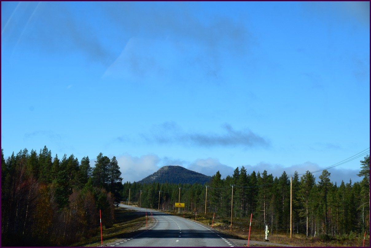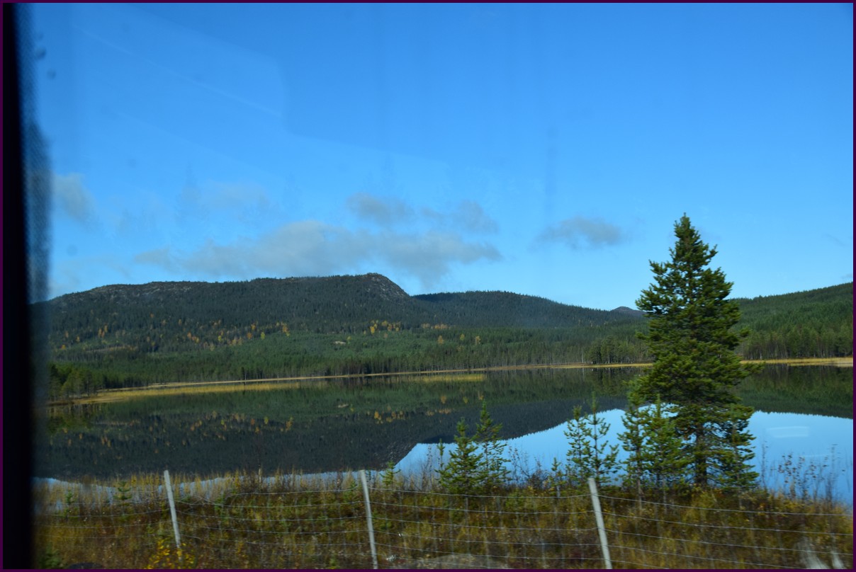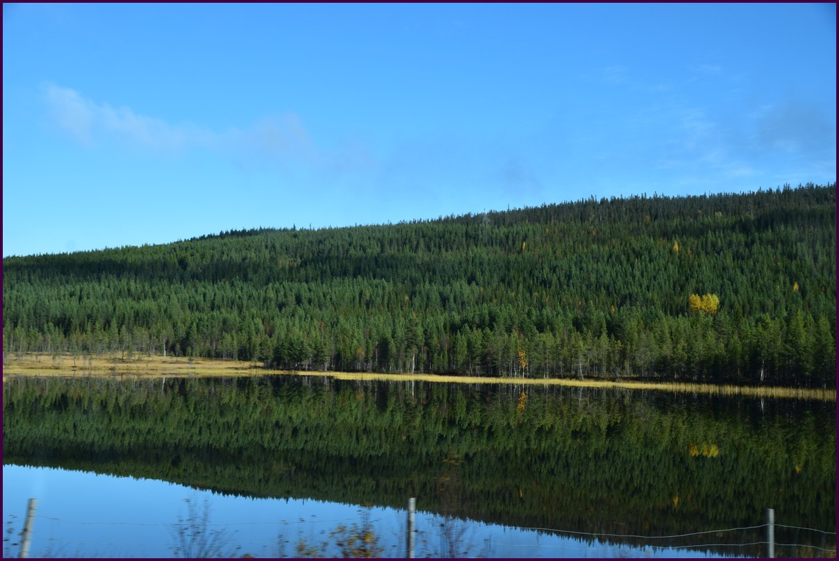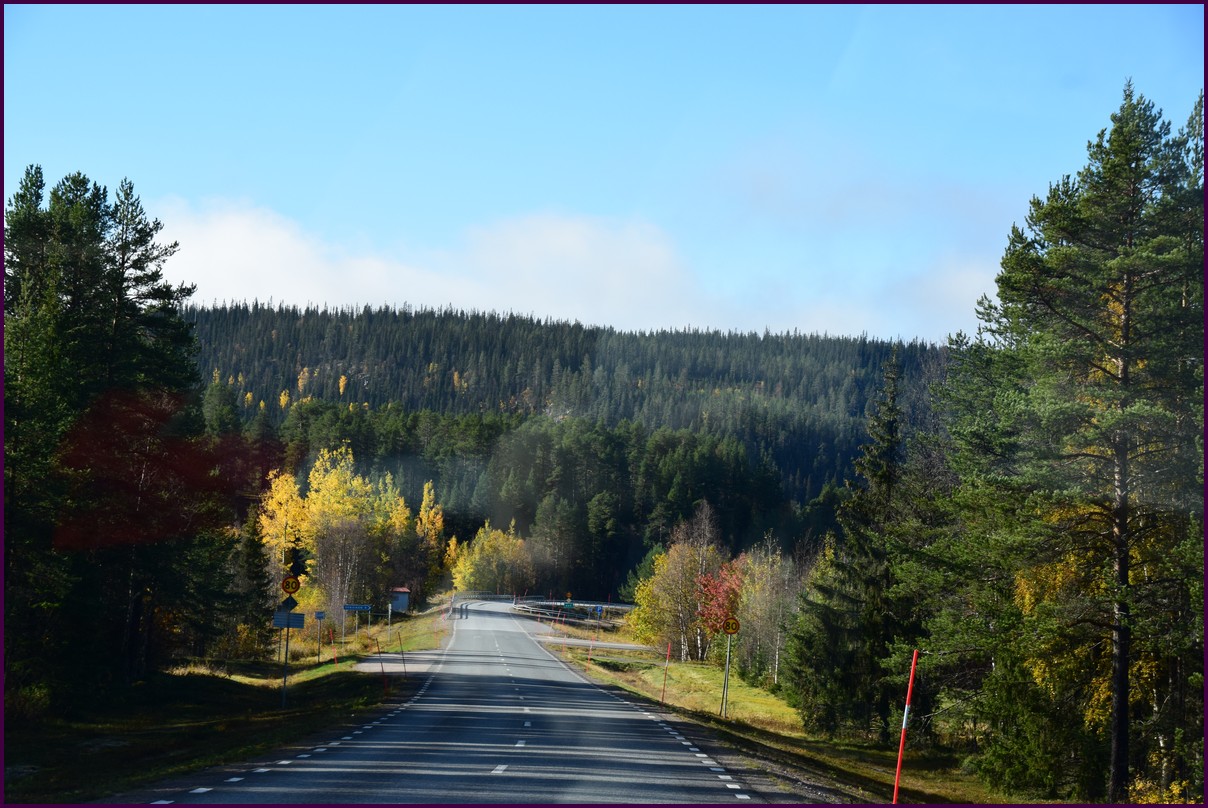 Toujours pas d'aurores cette nuit,nous décidons de prendre la route du retour par petites étapes. Ce matin,il fait 1° et il y a un épais brouillard. Nous reprenons la route au milieu des forêts de sapin à perte de vue, la circulation est pratiquement nulle nous croisons une voiture tous les 10 km en moyenne, on peu rouler tranquille. Le brouillard fini par se lever pour laisser place à un beau soleil, mais la tempèrature ne dépasse pas le 7°. Nous décidons de nous arrêter après 250 km on est pas pressé et nous caressons toujours l'espoir que les aurores viendront nous saluer.